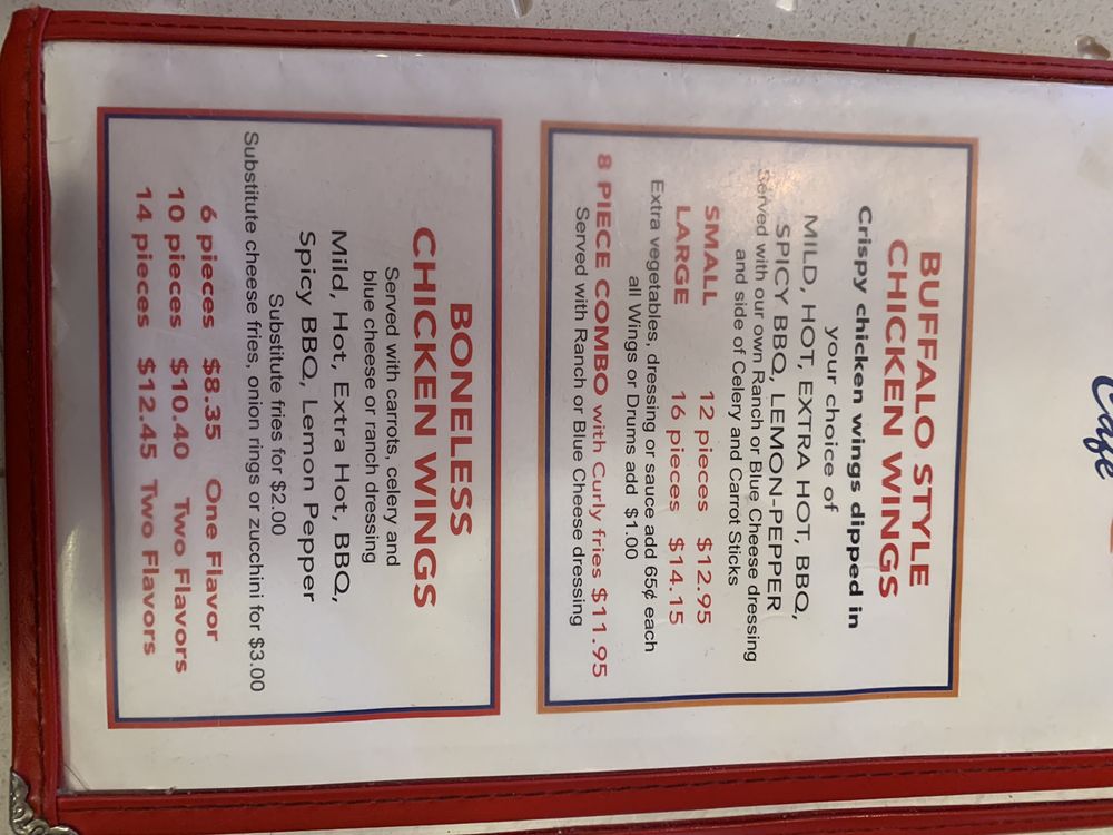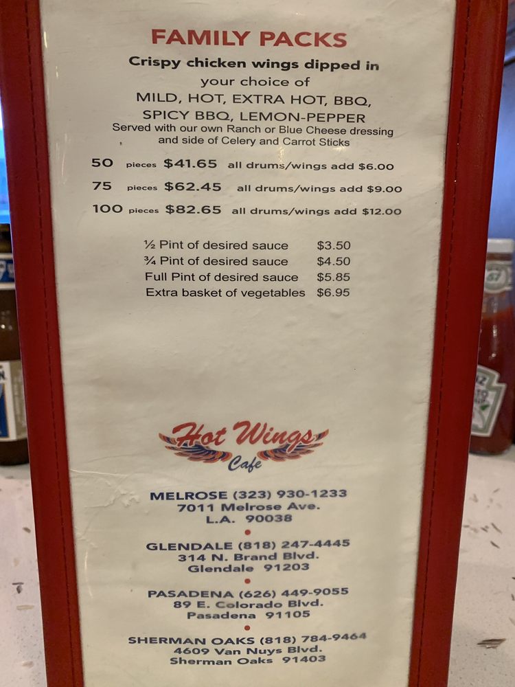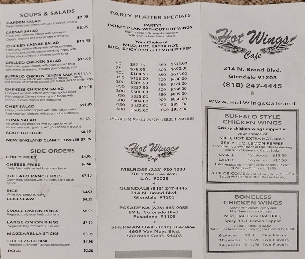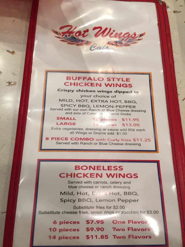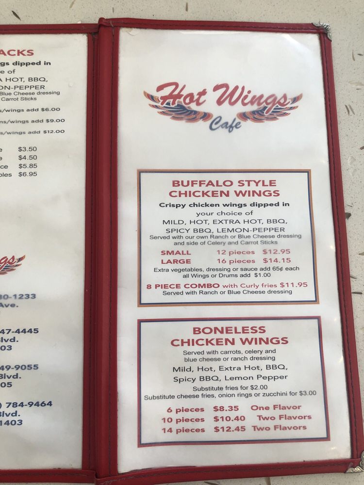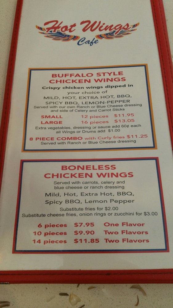 Hot Wings Cafe, located in Glendale, CA, offers a wide range of wings with various flavor options such as Mild, Hot, Extra Hot, BBQ, Spicy BBQ, and Lemonpepper. Featured items include Buffalo Style Chicken Wings and Boneless Chicken Wings served with celery, carrots, and your choice of dressing. The menu also includes salads, side orders like Curly Fries and Mozzarella Sticks, and an assortment of beverages. Customers rave about the fresh and delicious food, with one praising the 'perfection' of the wings and fries. Another complimented the 'great tasting buffalo sauce' and 'crispy chicken skin.' Overall, Hot Wings Cafe seems to be a popular spot for wing lovers seeking flavorful and well-prepared dishes with excellent service.