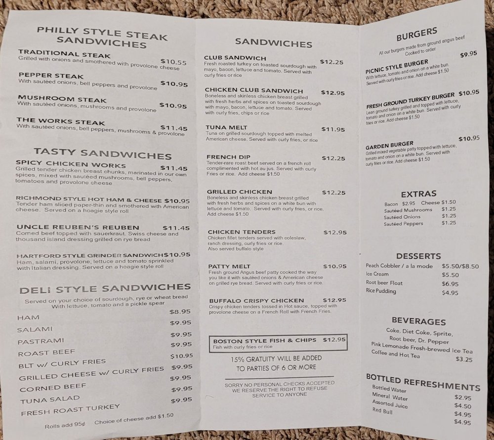 Fresh ground Angus beef patty cooked the way you like it with sautéed onions & American cheese on grilled rye bread. Served with curly fries or rice