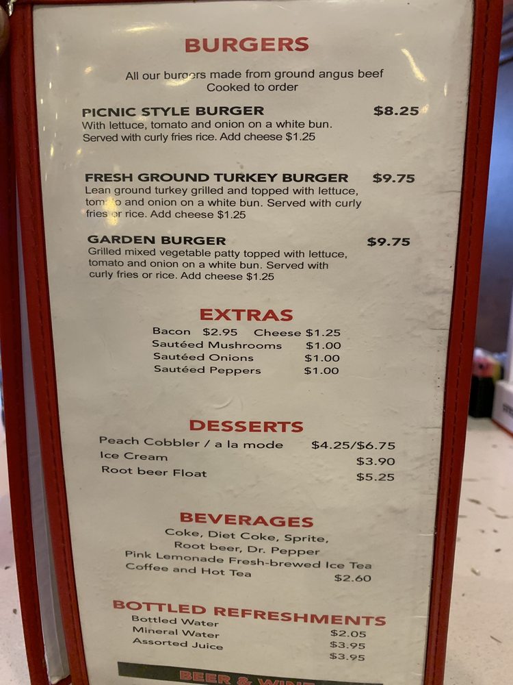 Lean ground turkey grilled and topped with lettuce, tomato and onion on a white bun. Served with curly fries or rice